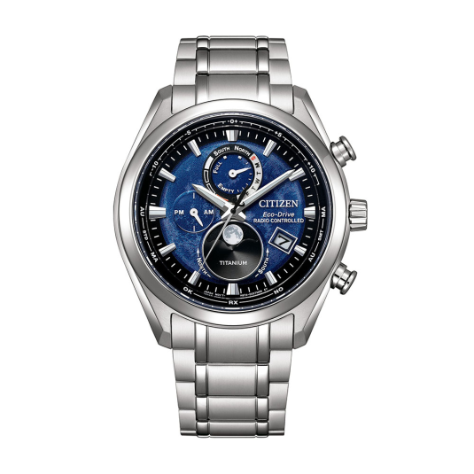 Pánske hodinky Citizen Tsukiyomi Moonphase Eco-Drive so systémom „radio controlled“ (systém plošného nastavovania elektronických prístrojov na presný čas s odchýlkou 1 sekunda za milión rokov).